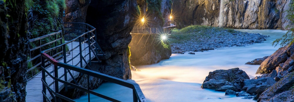 Die Aareschlucht bei Meiringen ist ein beeindruckendes Naturwunder des Berner Oberlands – in Jahrtausenden geformt vom Aaregletscher. Auf einem rund 1,4 Kilometer langen, gesicherten Weg führen Stege und Tunnel durch die enge Schlucht, in der sich die reissende Aare ihren Weg durch die Felsen gebahnt hat. Leises Plätschern, lautes Rauschen, Gletscherwasser, Gletschermühlen, Kalksteinformationen. Hautnah ein Naturwunder entdecken, spüren und erfahren. Durch Tunnel und über Stege sicher Geologie und Glaziologie erleben.